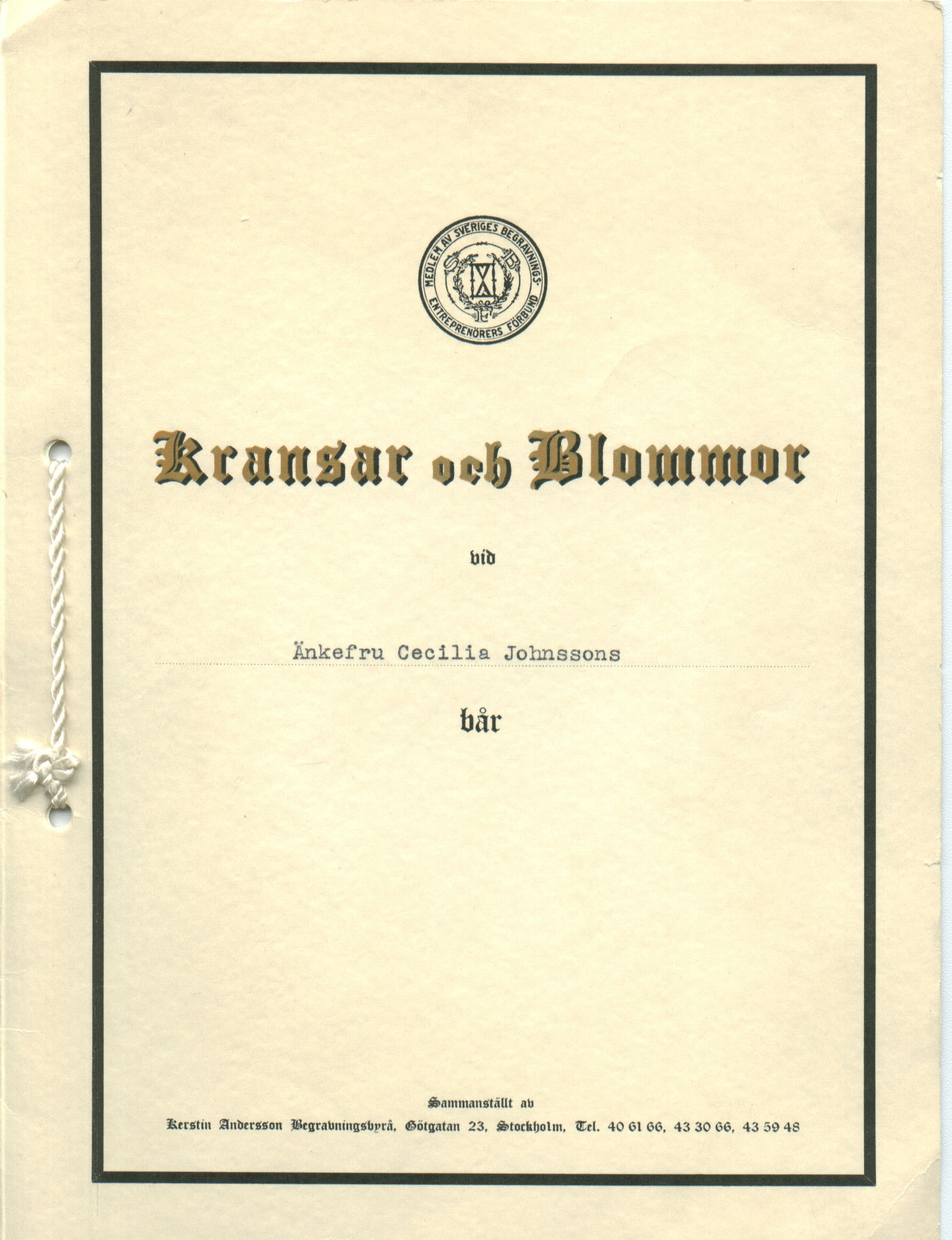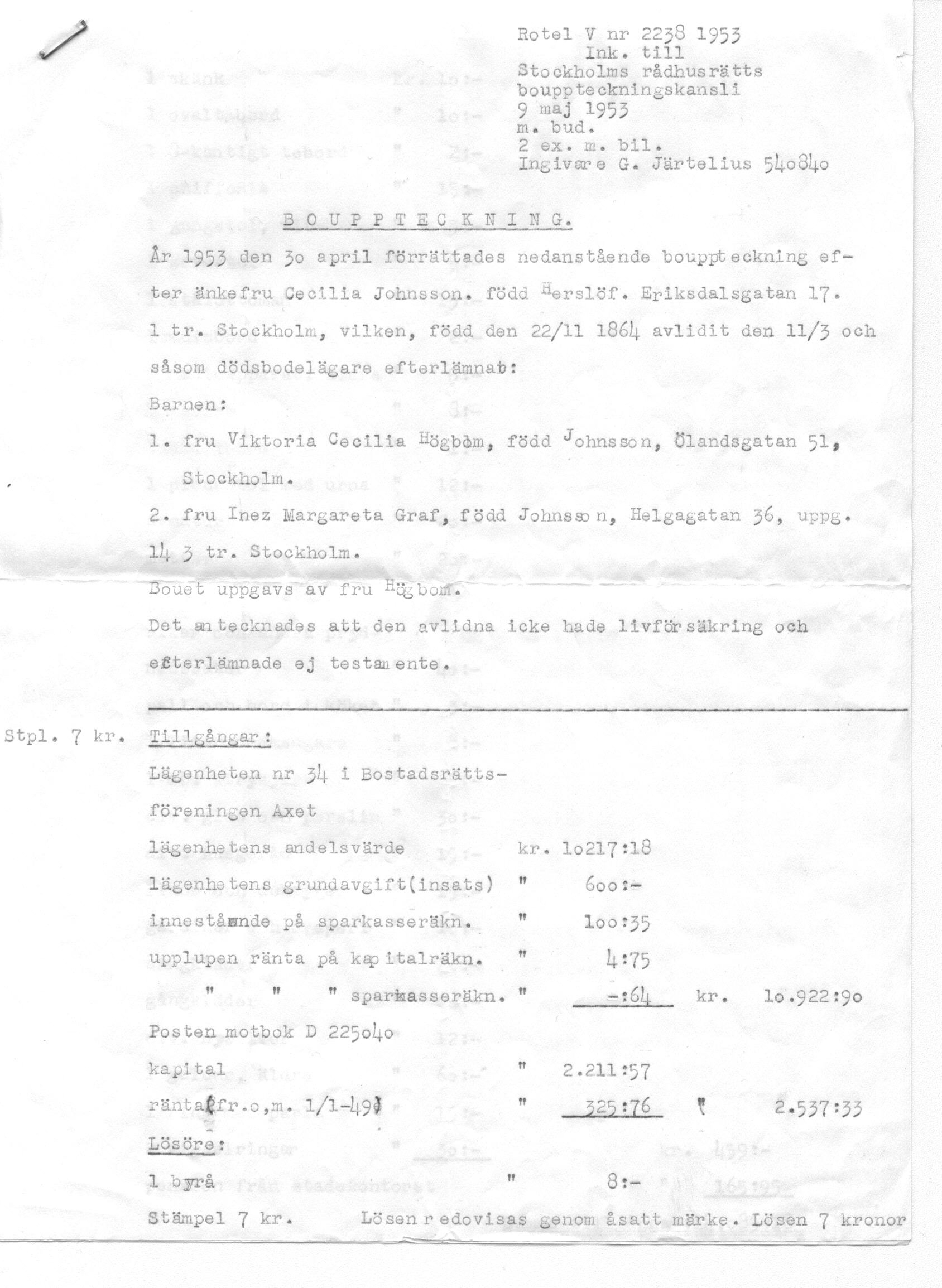 Estate Inventory - Cecilia Johnsson born Herslöf