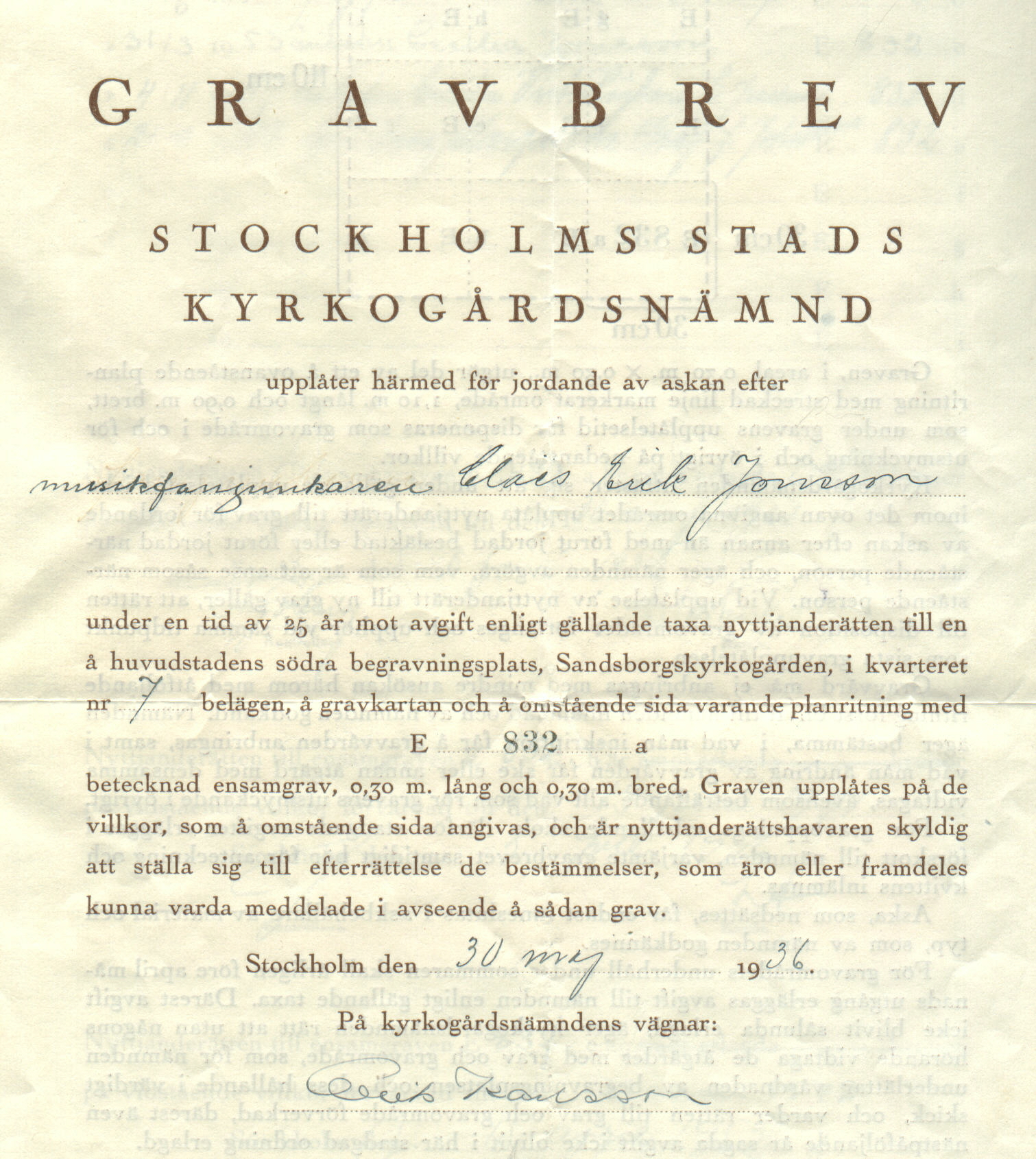 Musikfanjunkare Claes Erik Jonsson (September 29, 1867 -- May 16, 1936) Moved from Göta Livgardes Församling/Parish in Stockholm to Oscars Församling/Parish in Stockholm April 30, 1927.